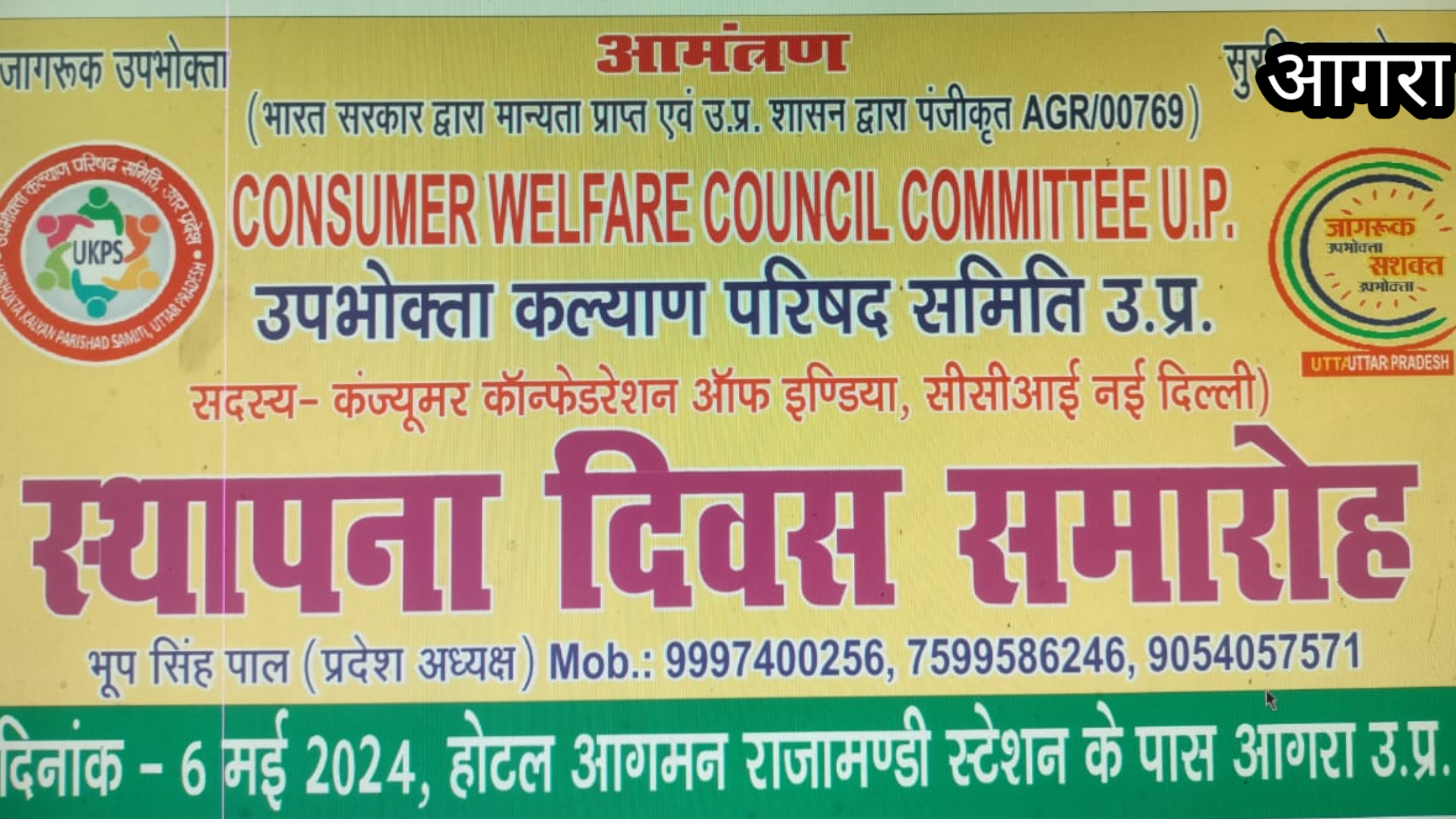 दिनांक 6 /5 /2024 को होटल आगमन आगरा में उपभोक्ता कल्याण परिषद समिति उत्तर प्रदेश के स्थापना दिवस पर एक कार्यक्रम का आयोजन किया गया जिसमें कंज्यूमर कनफेडरेशन ऑफ इंडिया सी सी आई नई दिल्ली के नेशनल अध्यक्ष डॉ अनंत शर्मा मुख्य अतिथि के रूप में उपस्थित रहे जिसमें राजस्थान तमिलनाडु गुजरात चेन्नई दिल्ली उत्तर प्रदेश अनेक पदाधिकारी उपस्थिति हुए सभी पदाधिकारी ने उपभोक्ताओं के हितों को लेकर अपने-अपने सुझाव और विचार दिए , इसी कार्यक्रम में (उपभोक्ता कल्याण परिषद समिति के प्रदेश उपाध्यक्ष राजेश सिसोदिया जी का डॉ अनंत शर्मा व प्रदेश अध्यक्ष भूप सिंह पाल द्वारा सोल उड़ा कर फूल माला व प्रतीक चिन्ह देकर जोशीला स्वागत किया गया और राजेश सिसोदिया को उनके अच्छे कार्य के लिए बहुत-बहुत बधाई दी गई)! इस मौके पर डायरेक्टर कैलाश कुमावत जयपुर प्रीति पांडे गुजरात सेल्फ राज तमिलनाडु भूप सिंह पाल आगरा रमाशंकर शर्मा आगरा राहुल कुलश्रेष्ठ एटा ,अखिलेश पचौरी एटा ,संध्या गौतम फिरोजाबाद , कुसम लता शर्मा हाथरस, प्रदेश सचिव शोभा मीना आगरा ,सरिता कौशिक हाथरस ,ताहिर हुसैन संगठन सचिव अलीगढ़ ,डीएस चौहान केपी सिंह सलीम खान फिरोजाबाद, राजेश कुमार शर्मा फिरोजाबाद ,आदि लोग उपस्थित रहे