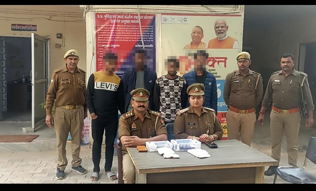 आज दिनांक 15.11.2023 को पुलिस अधीक्षक हाथरस श्री देवेश कुमार पाण्डेय के आदेशानुसार चलाये जा रहे संदिग्ध व्यक्ति/वाहन चेकिंग अभियान के क्रम में अपर पुलिस अधीक्षक हाथरस के निर्देशन एवं क्षेत्राधिकारी सादाबाद के निकट पर्यवेक्षण में थाना चंदपा पुलिस द्वारा मुखबिर की सूचना पर कार्यवाही करते हुए कार में बैठकर लूट की योजना बना रहे 04 अभियुक्तों को गिरफ्तार किया गया है । जिनके कब्जे से 02 तमंचा व 05 जिन्दा कारतूस 315 बोर, 800 ग्राम नशीला पाउडर एवं एक कार मारूति सियाज सं- UP 14 CW 6000 बरामद हुई है । अभियुक्तों की गिरफ्तारी एवं बरामदगी के सम्बन्ध में थाना चंदपा पर सुसंगत धाराओं में अभियोग पंजीकृत कर आवश्यक वैधानिक कार्यवाही की जा रही है ।