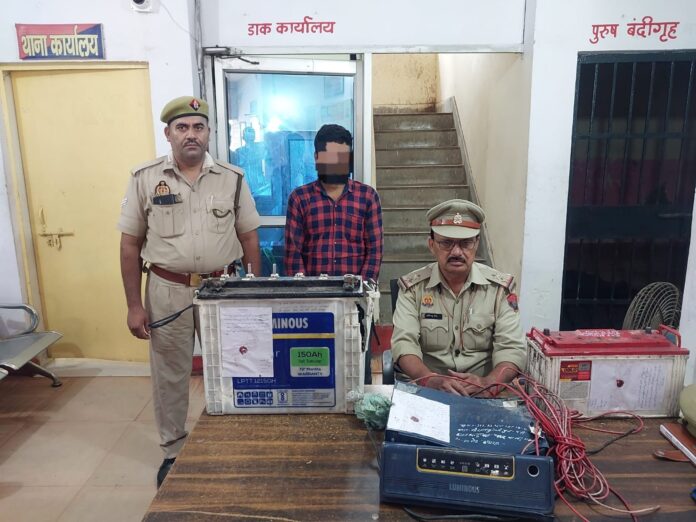 थाना हाथरस गेट पुलिस व एस0ओ0जी0 टीम की संयुक्त कार्यवाही में थाना हाथरस गेट क्षेत्र में हुई चोरी की घटना का सफल अनावरण करते हुए 01 चोर को किया गिरफ्तार, कब्जे से चोरी का 01 इन्वर्टर, 02 बैटरी तथा घटना में प्रयुक्त एक छोटा हाथी बरामद ।*