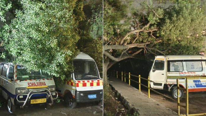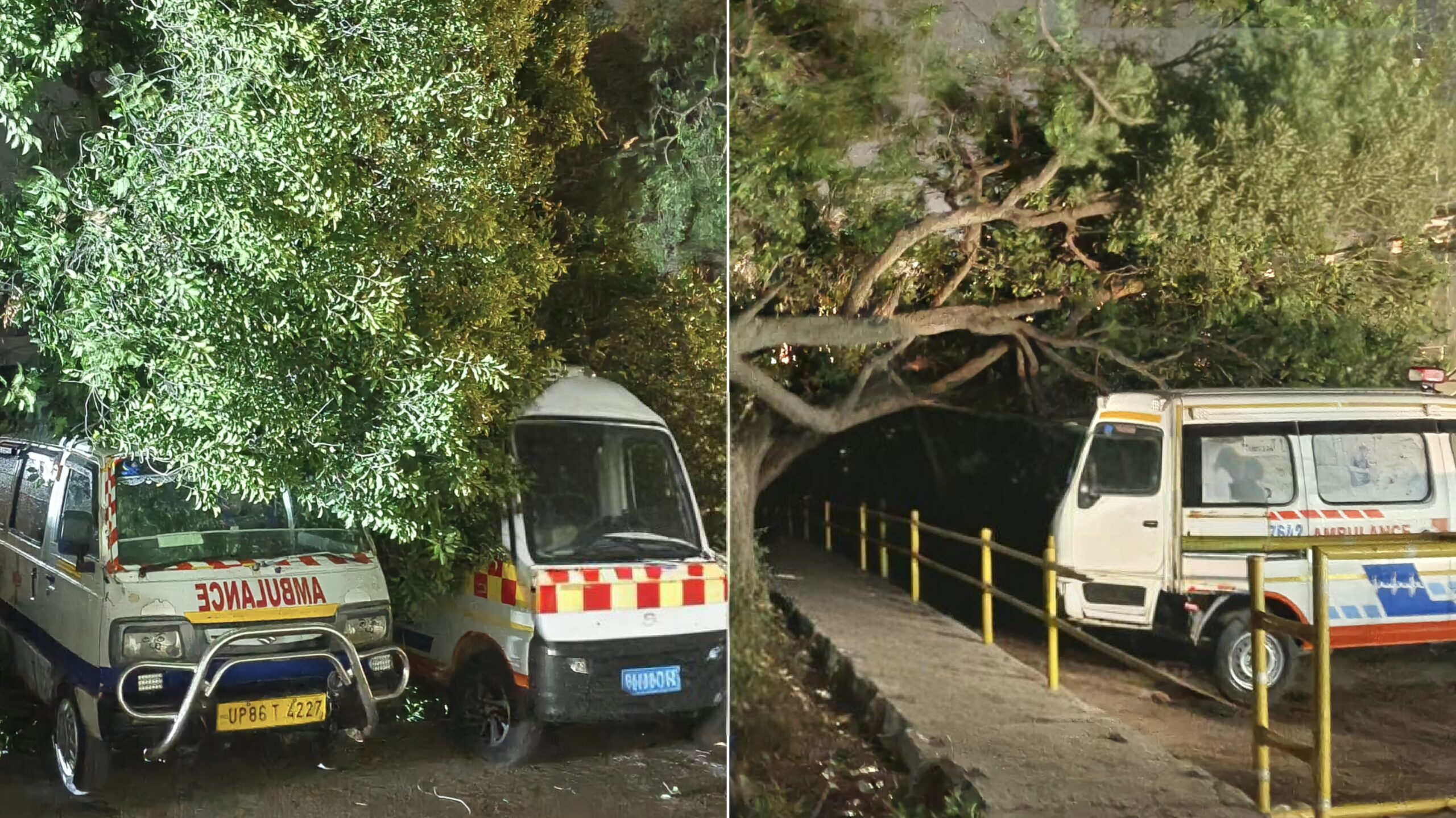 पेड़ गिरते ही जोरदार धमाके की आवाज गूंजी, जिससे मौके पर मौजूद लोगों में हड़कंप मच गया। इस हादसे में दो प्राइवेट एंबुलेंस बुरी तरह क्षतिग्रस्त हो गईं। राहत की बात यह रही कि दोनों एंबुलेंस के चालक बाल-बाल बच गए और किसी तरह अपनी जान बचाने में सफल रहे।