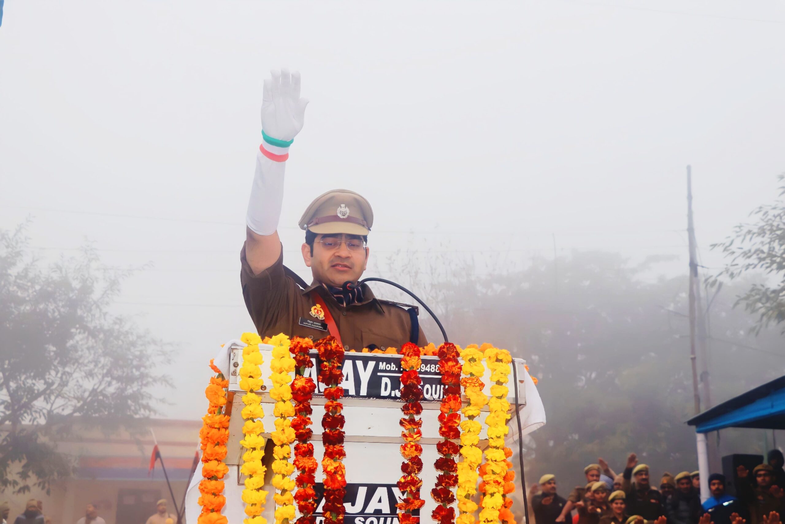 आज दिनांक 26.01.2024 को 75 वें गणतंत्र दिवस के अवसर पर पुलिस अधीक्षक हाथरस श्री निपुण अग्रवाल के निर्देशन में रिजर्व पुलिस लाइन हाथरस में भव्य परेड का आयोजन किया गया। गणतंत्र दिवस के अवसर पर परेड का मान प्रणाम मुख्य अतिथि माननीय राज्य मंत्री (स्व0प्र0), समाज कल्याण विभाग, उत्तर प्रदेश शासन श्री असीम अरुण महोदय द्वारा ग्रहण किया गया । इस भव्य परेड के समय माननीय विधायक सदर. माननीय विधायक सिकन्द्राराऊ, माननीय जनपद न्यायाधीश महोदय, जिलाधिकारी हाथरस महोदया व जनपद के पुलिस/प्रशासनिक व न्यायिक अधिकारी व कर्मचारीगण सहित अतिथि गण, सम्मानित जनप्रतिनिधिगण, पत्रकार बन्धु तथा विद्यालयो के शिक्षक व छात्र/छात्रायें उपस्थित रहे।