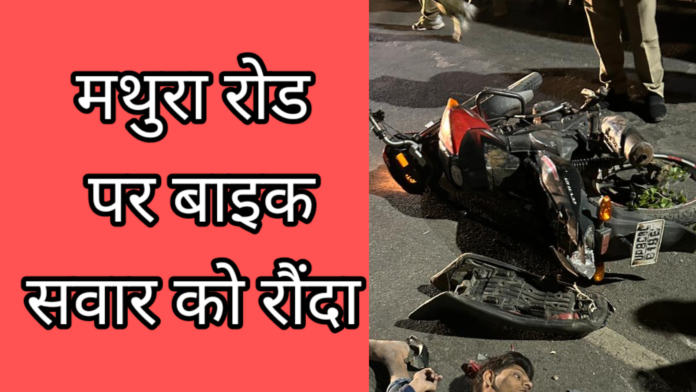 आपको बतादी की थाना हाथरस गेट क्षेत्र के मथुरा रोड कृष्णा हॉस्पिटल के पास बीती रात लगभग दस बजे एक अज्ञात वाहन ने बाइक सवार युवक को रौंद डाला इस दुर्घटना में बाइक सवार युवक की मौके पर ही दर्दनाक मौत हो गई दुर्घटना के बाद मौके लोगों की भीड़ एकत्रित हो गयी सूचना मिलेने के बाद पुलिस भी मोके पर पहुँच गई और मृतक युवक के शव को कब्जे में लेकर पोस्टमार्टम के लिए भेज दिया है